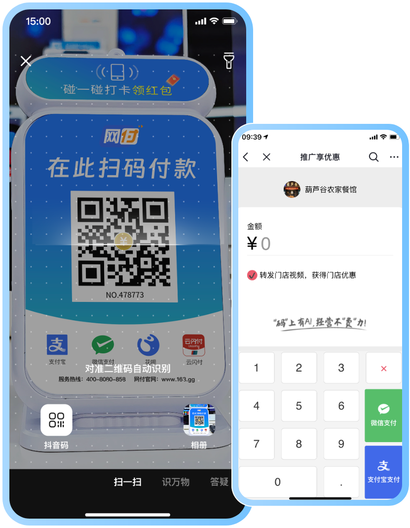 抖音扫码支付。升级后的网付AI云音响,除了可以支持微信支付跟支付宝支付之外,还支持抖音扫码支付。目前这个功能在市面上其他的一些碰一下营销收款码中,很多都是不具备的。用抖音扫码支付之后,会弹出一个商家的视频,顾客只需点击一下,就可以一键转发这个视频,为店铺带来更多的曝光。